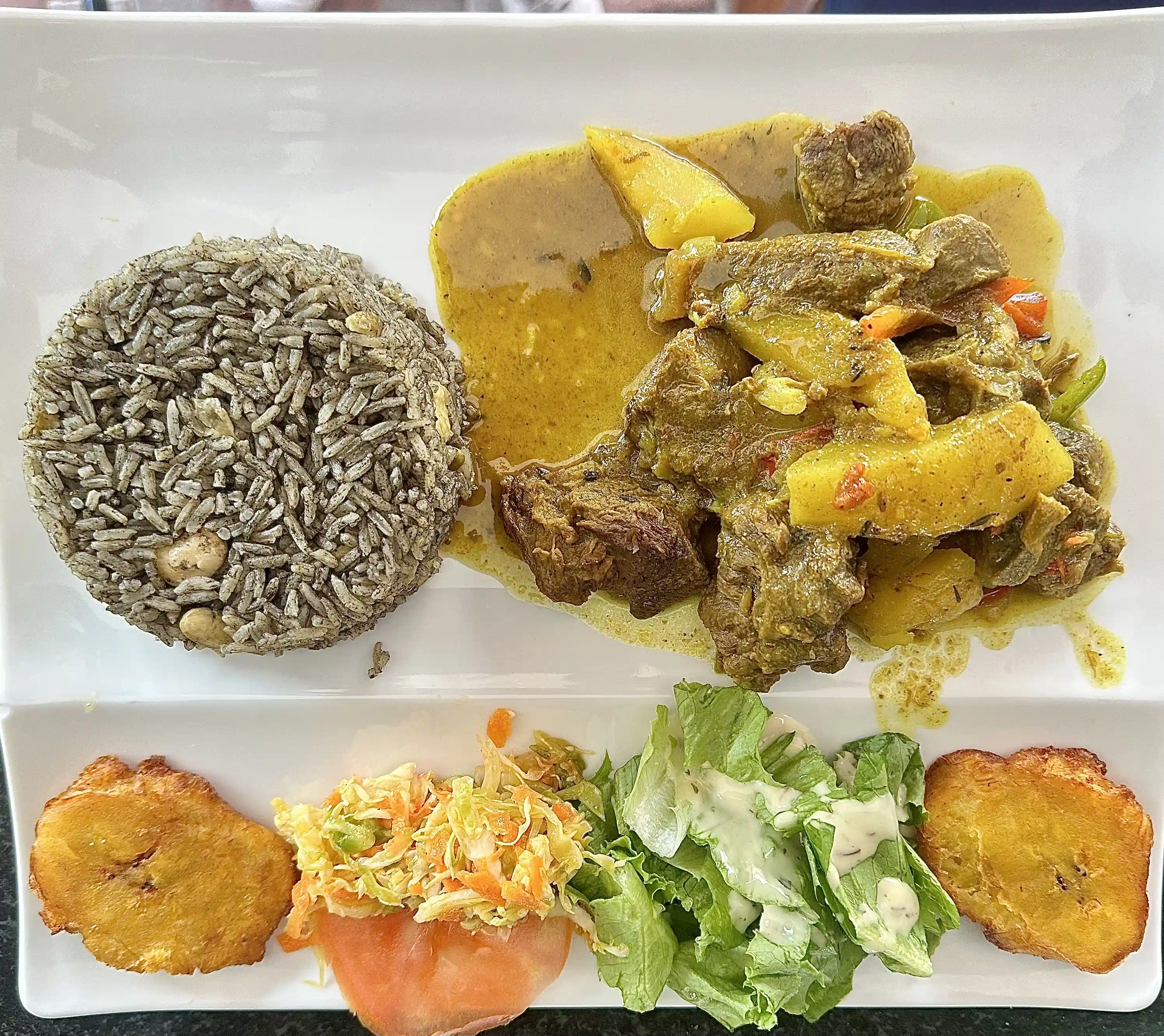 Goat Meat, Choice of Side Dishes, Salad