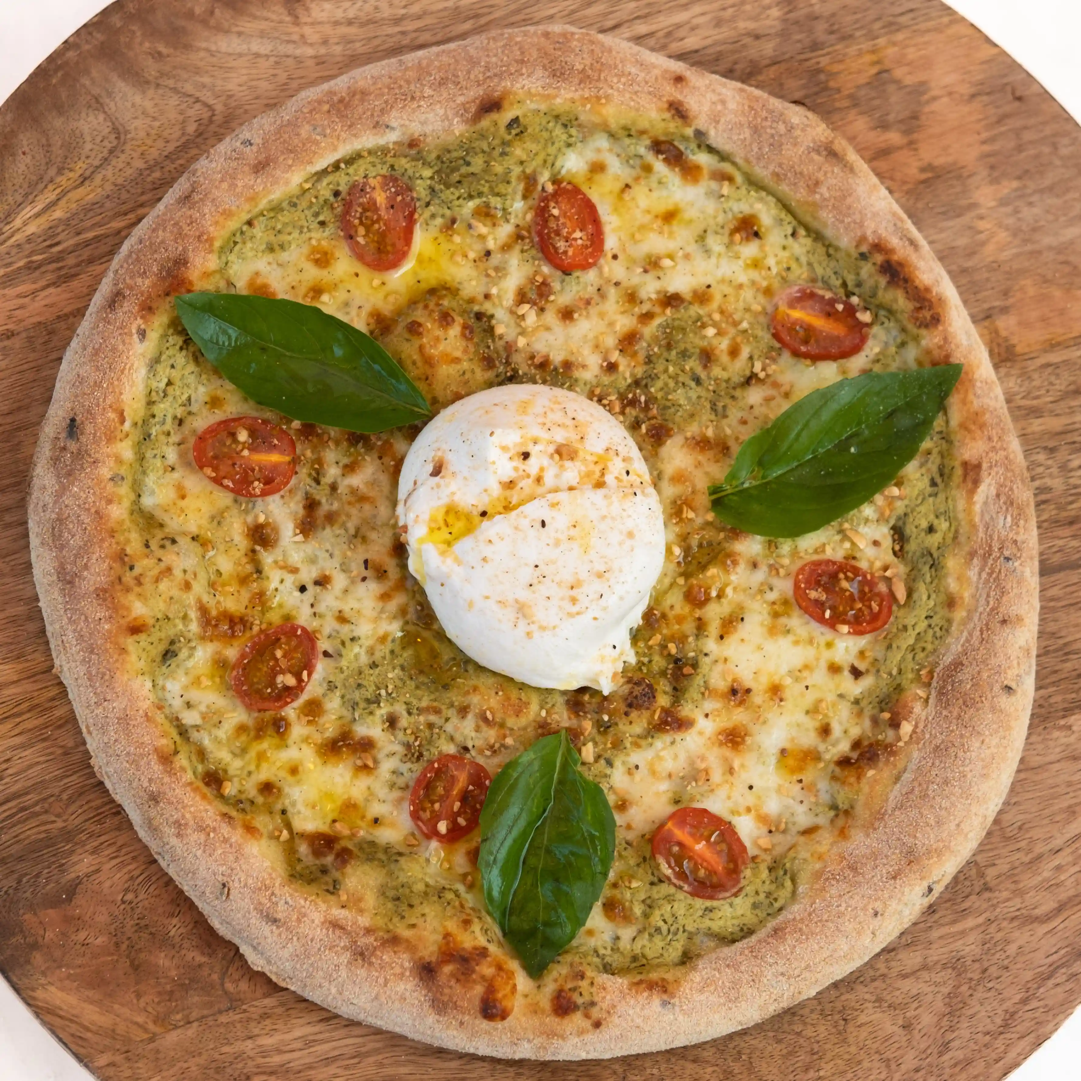 Chef's basil cream, Mozzarella, Cherry tomatoes, After cooking: Burrata (125g), Roasted almonds, Extra virgin olive oil…