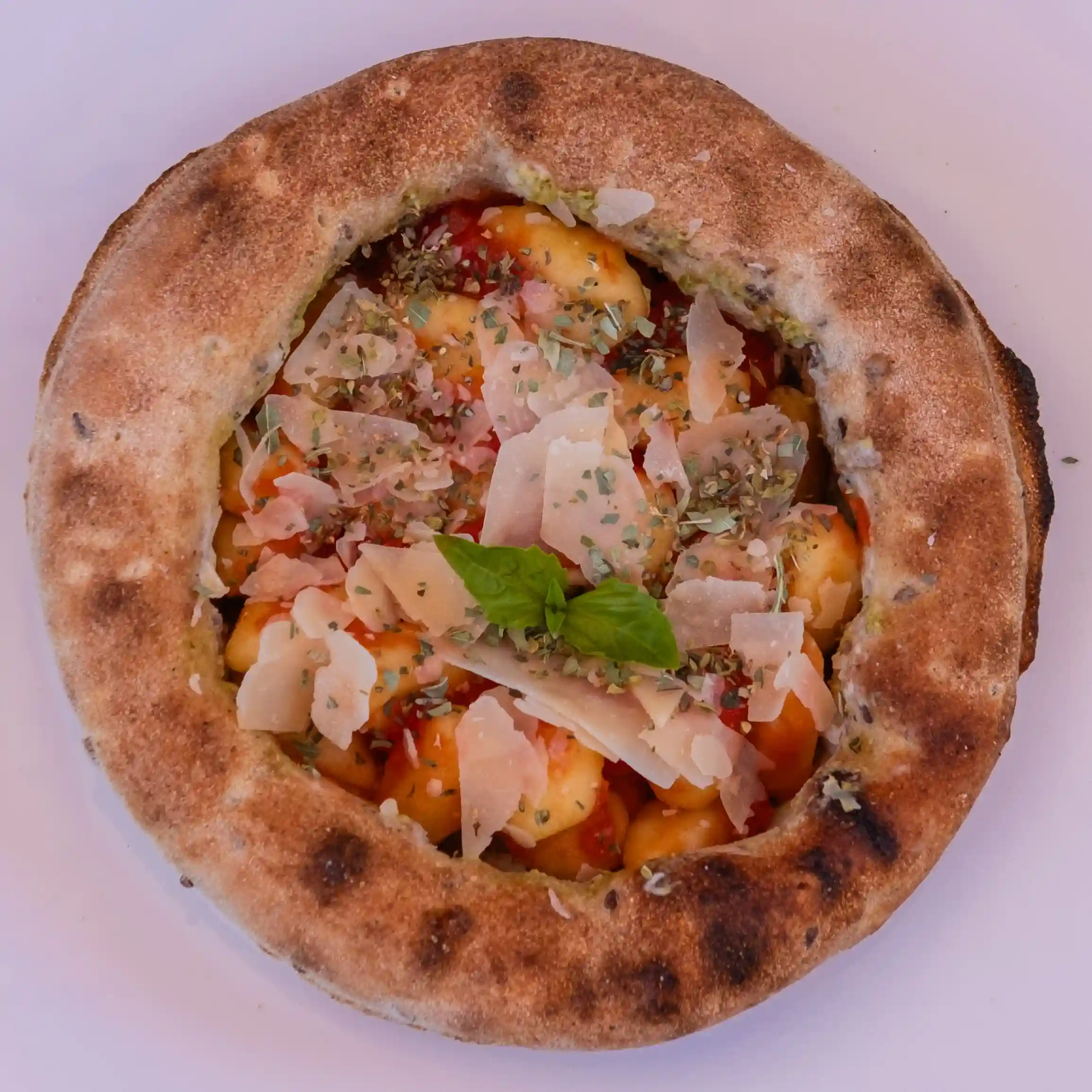 Tasty gnocchi served in a crispy pizza dough bowl, Chef's Bolognaise sauce, Parmesan shavings, Basil