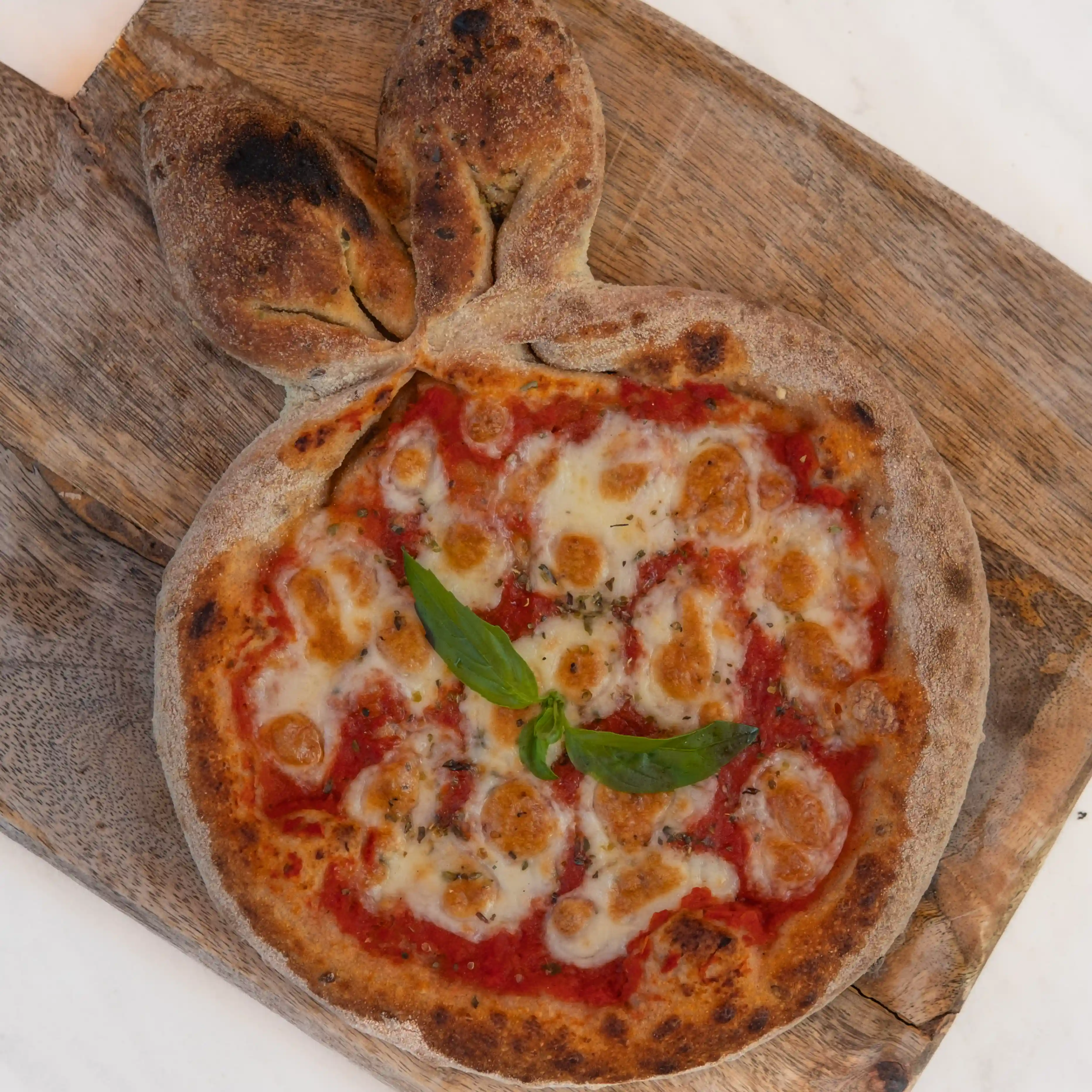 Tomato sauce, Mozzarella, Basil, After cooking: Oregano, Extra virgin olive oil drizzle