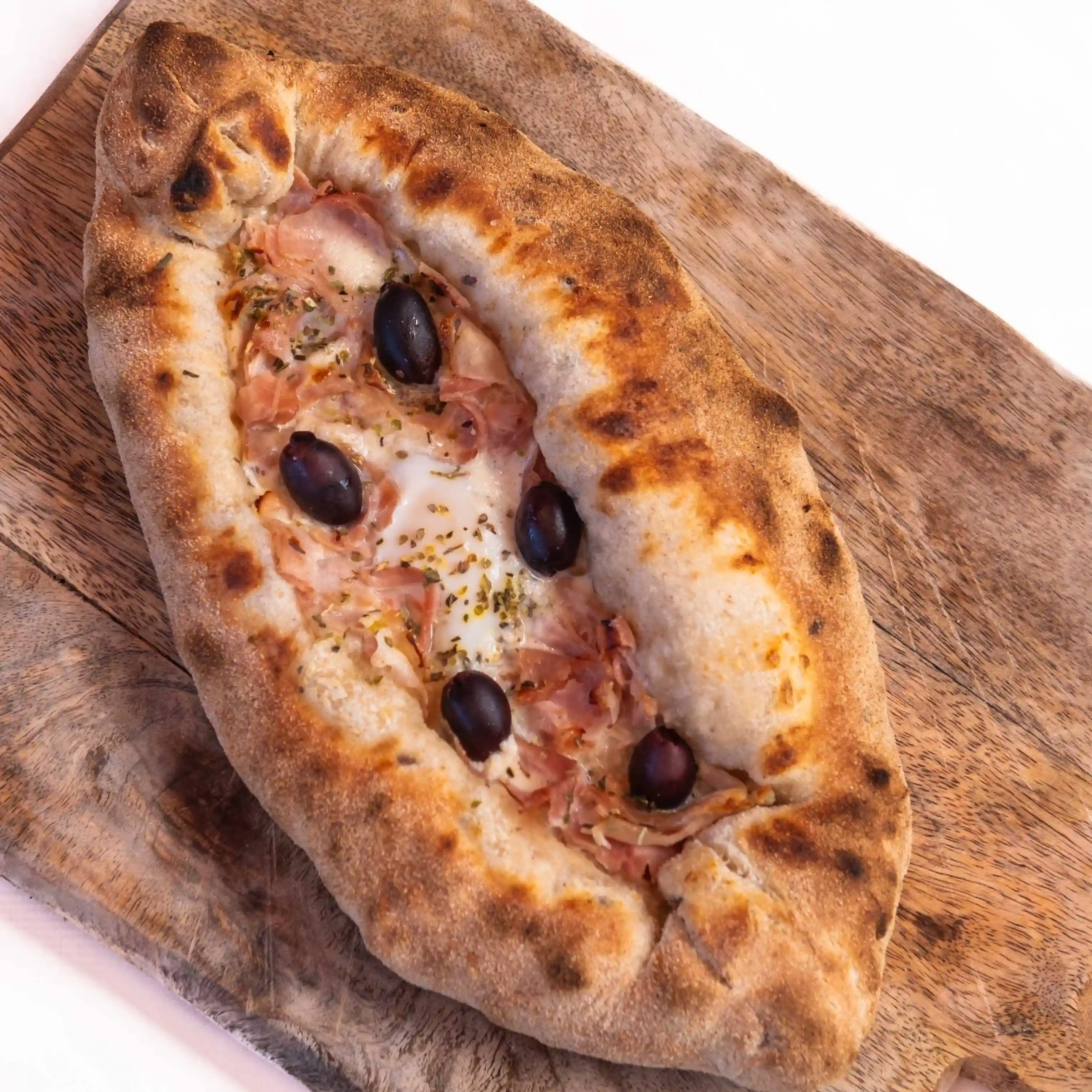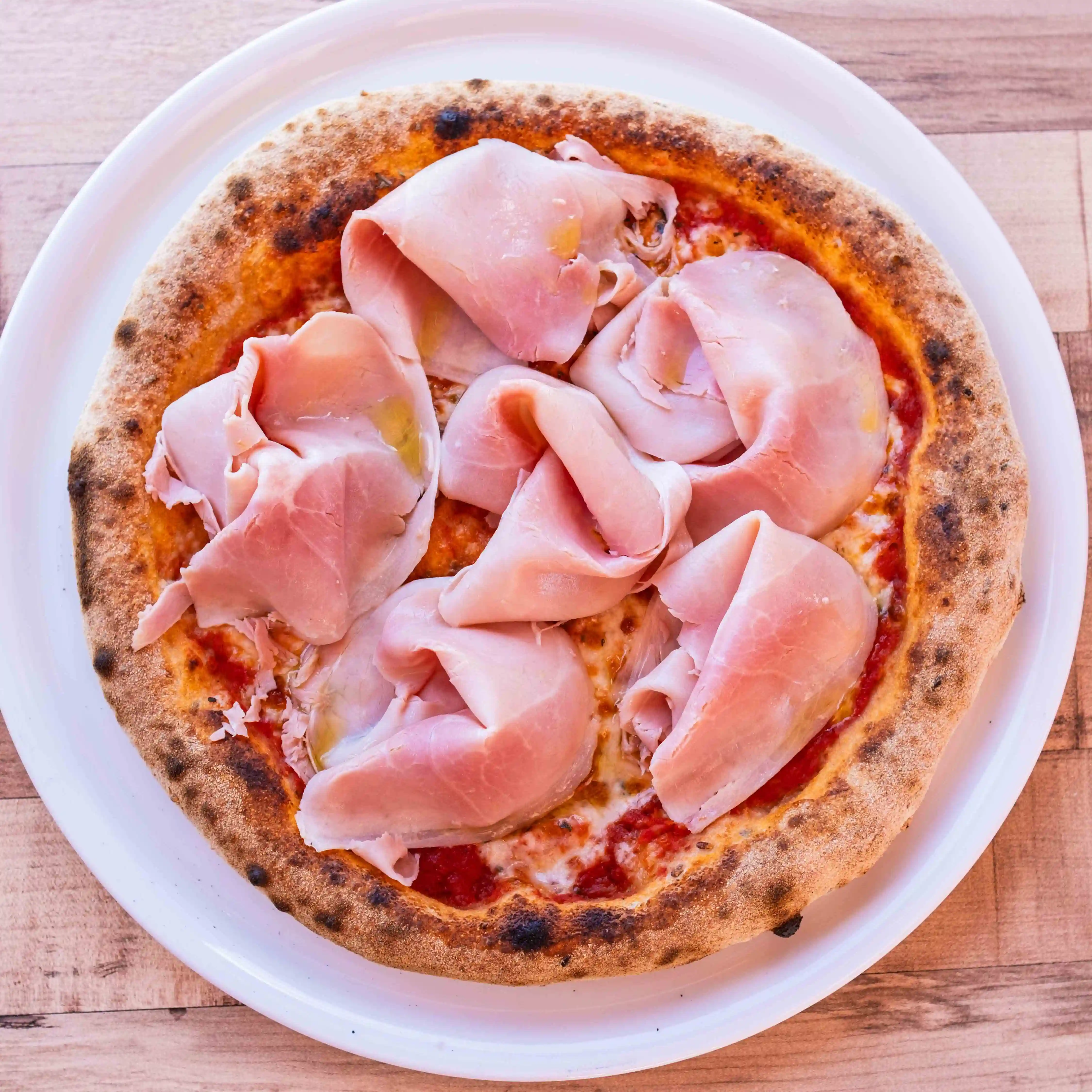 Tomato sauce, Mozzarella, After cooking: prosciutto cotto, Oregano, Extra virgin olive oil drizzle