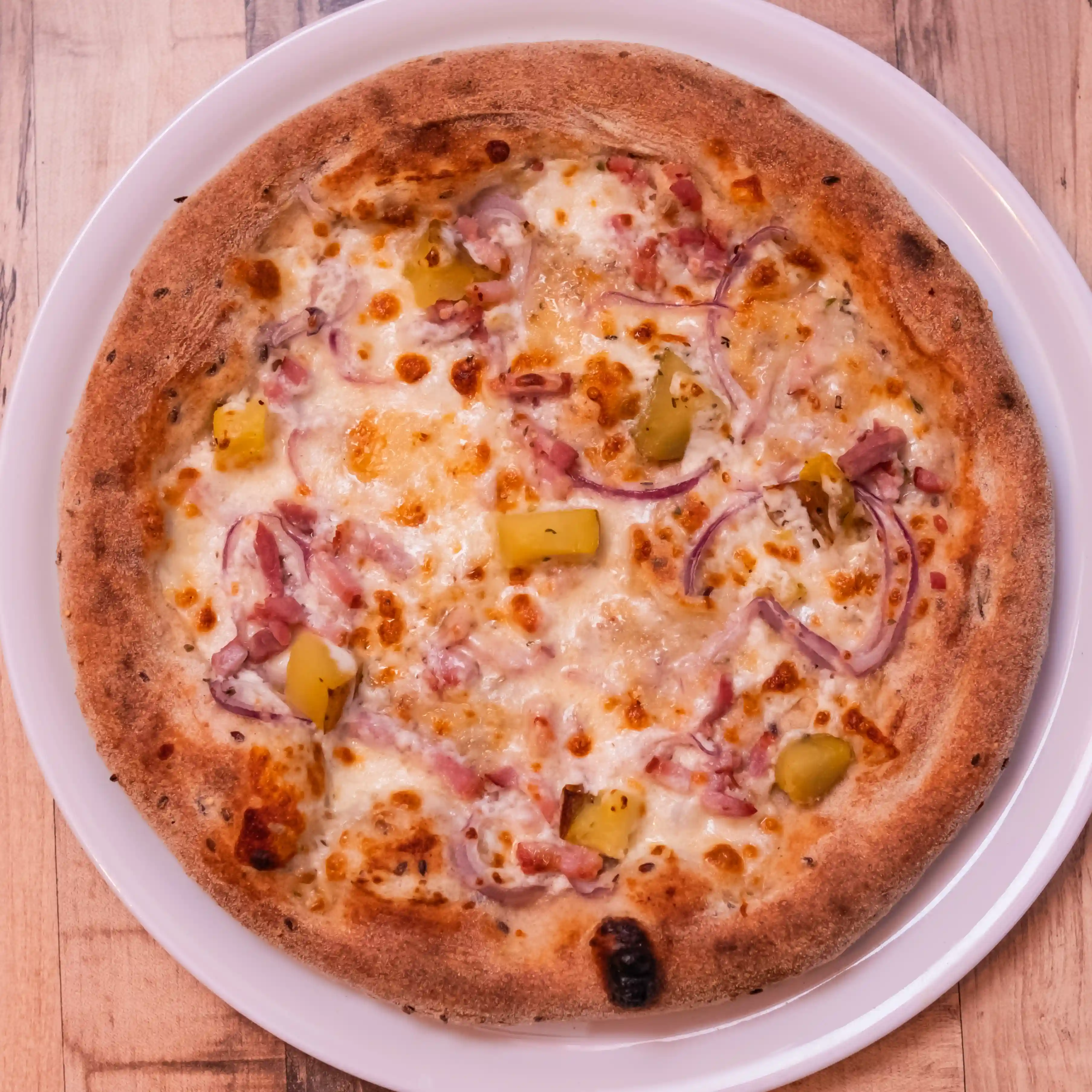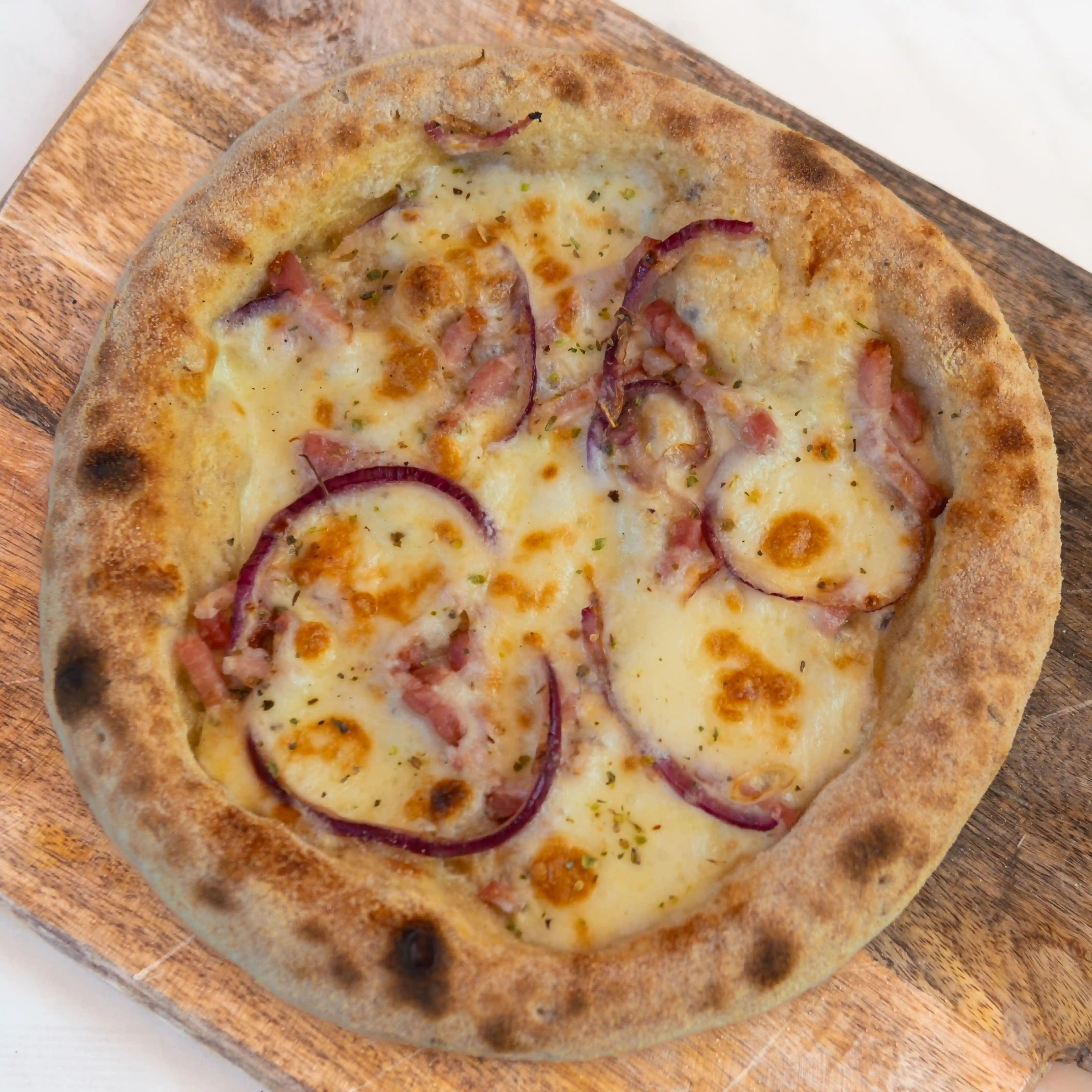 Crème fraîche, Mozzarella, Lardons, Potatoes, Taleggio cheese, Red onions