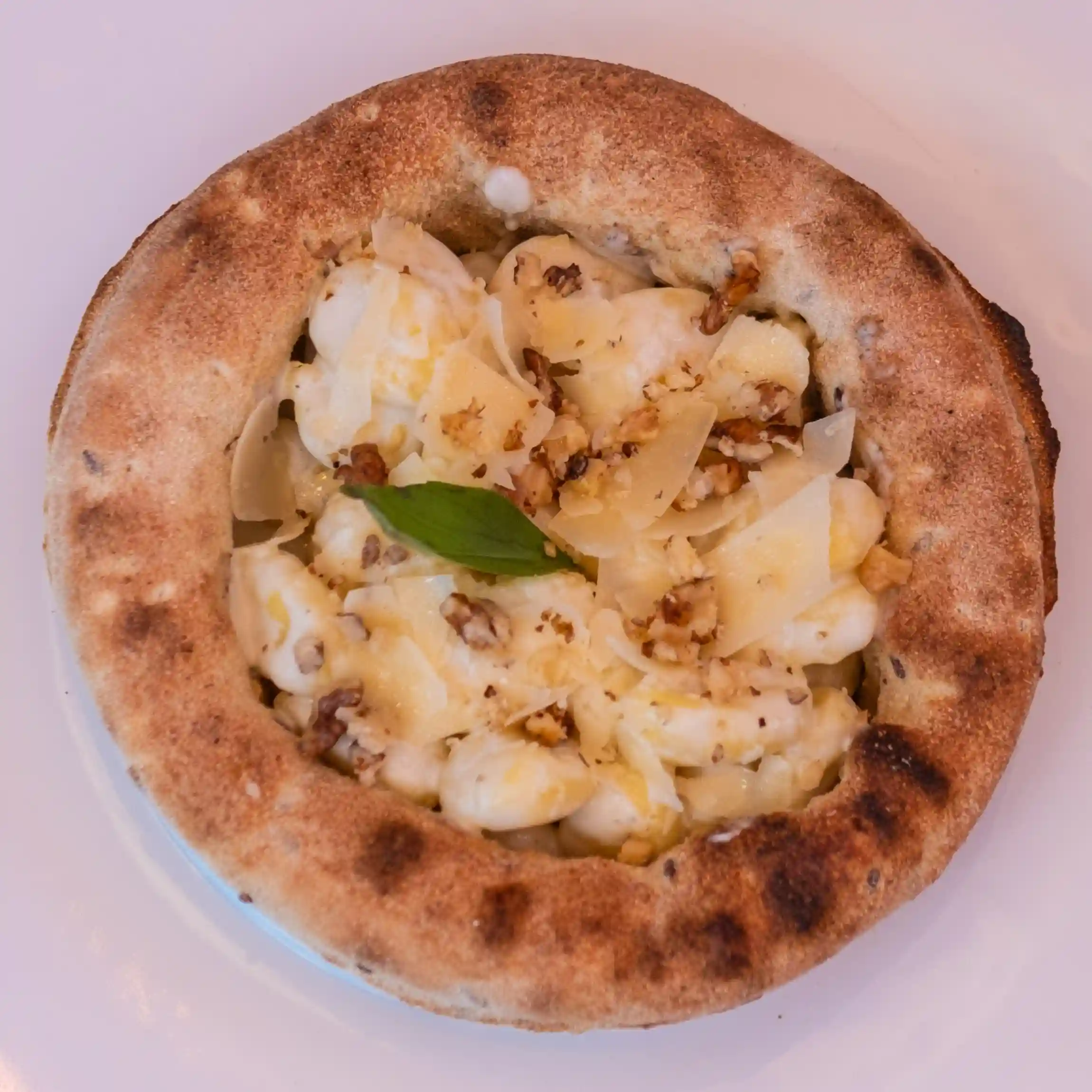 Tasty Gnocchi served in a pizza dough bowl, Gorgonzola sauce, crushed walnuts, Parmesan shavings, Basil leaf.