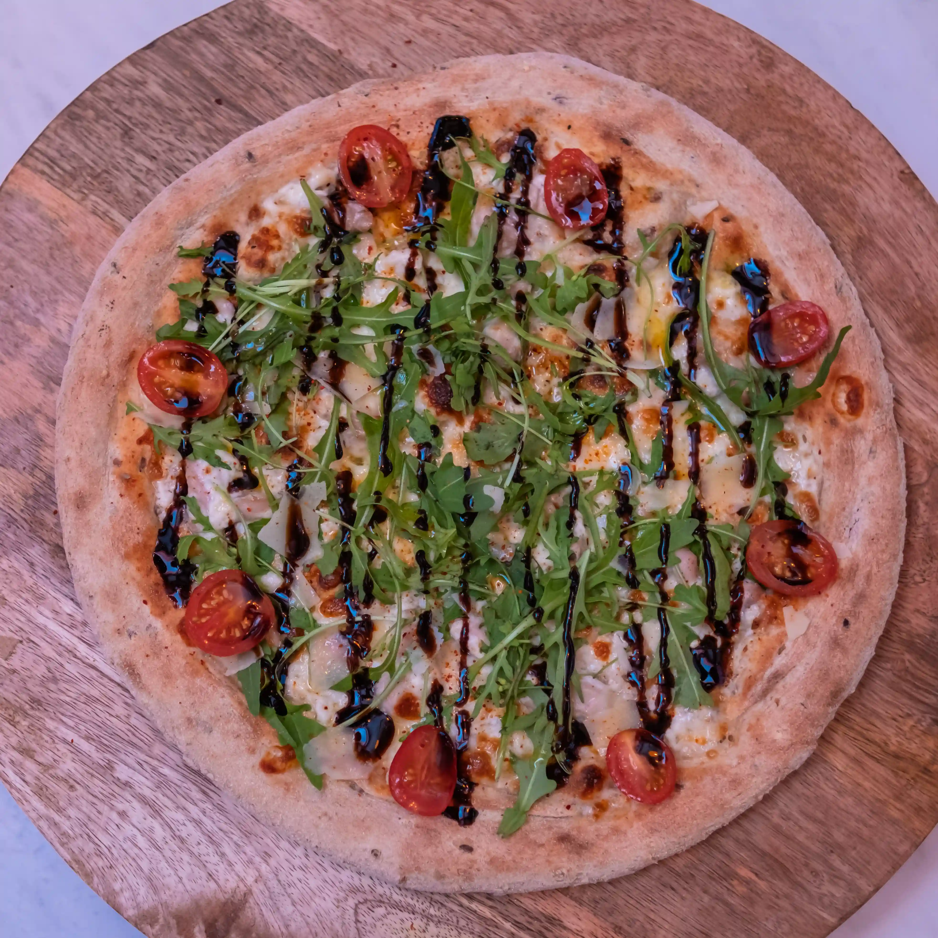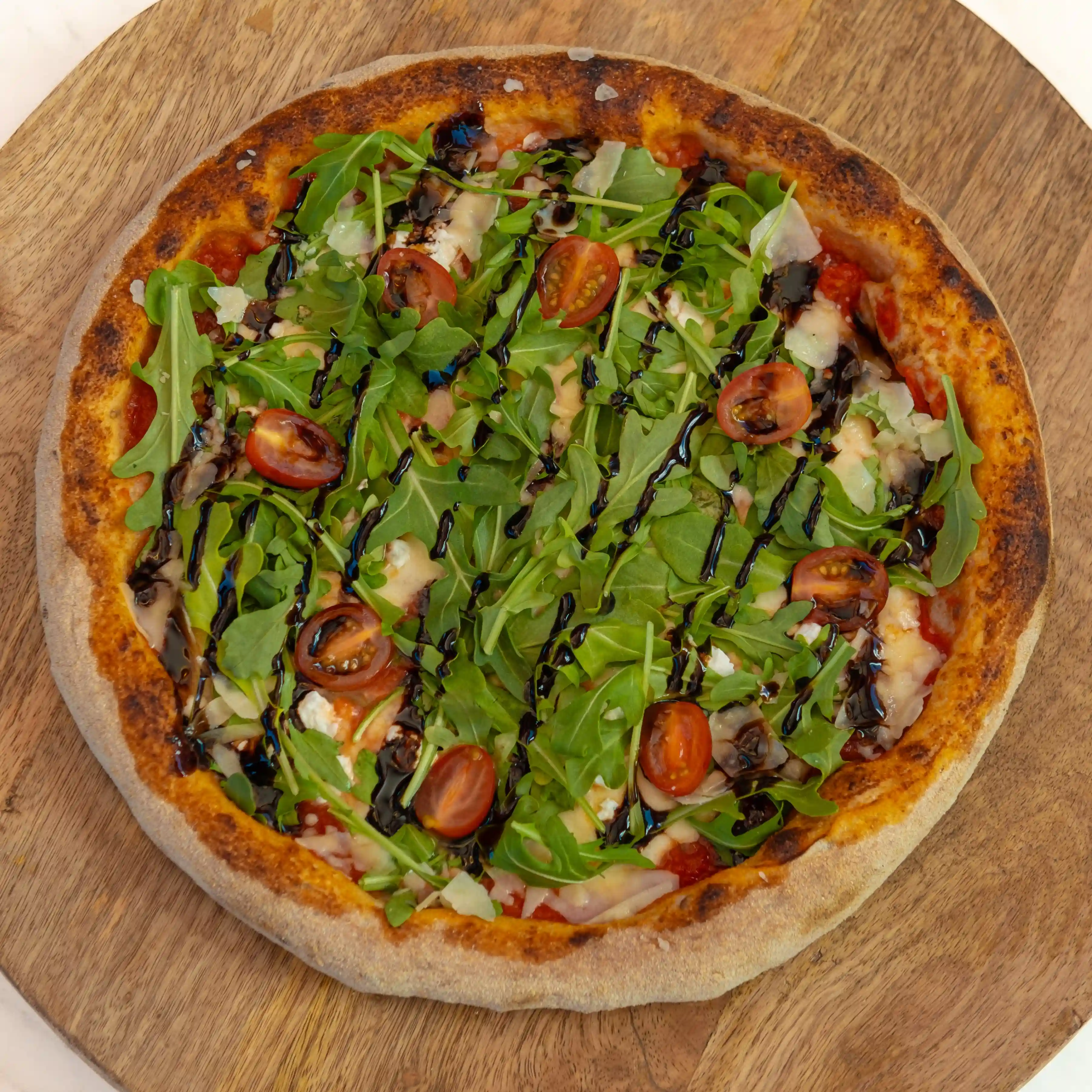 Tomato sauce, Mozzarella, After cooking: arugula, Cherry tomatoes, Crumbled goat cheese, Parmesan, Balsamic vinegar
