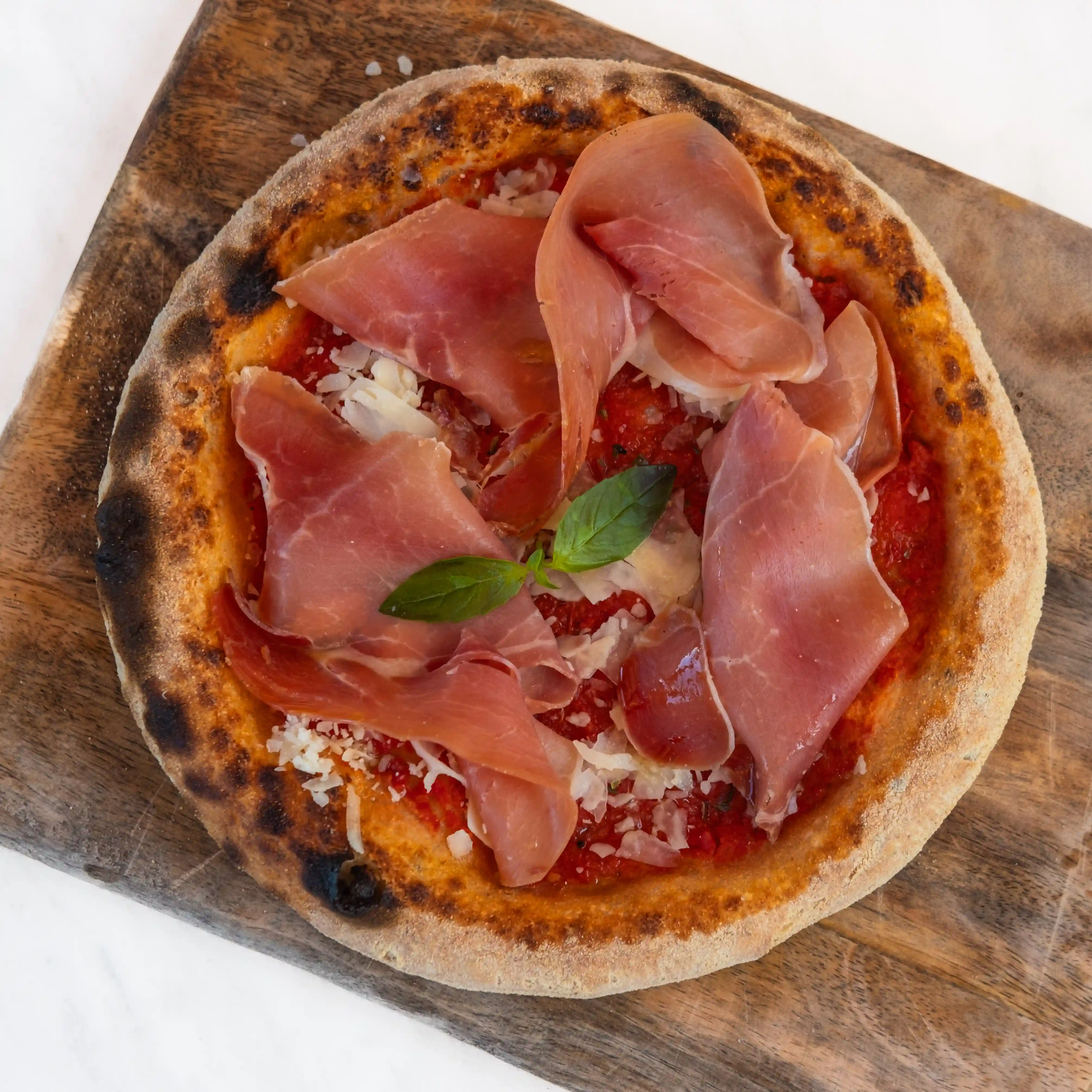 Tomato sauce, Oregano, After cooking: arugula, Prosciutto crudo ham, Burrata (125g), Fillet of extra virgin olive oil