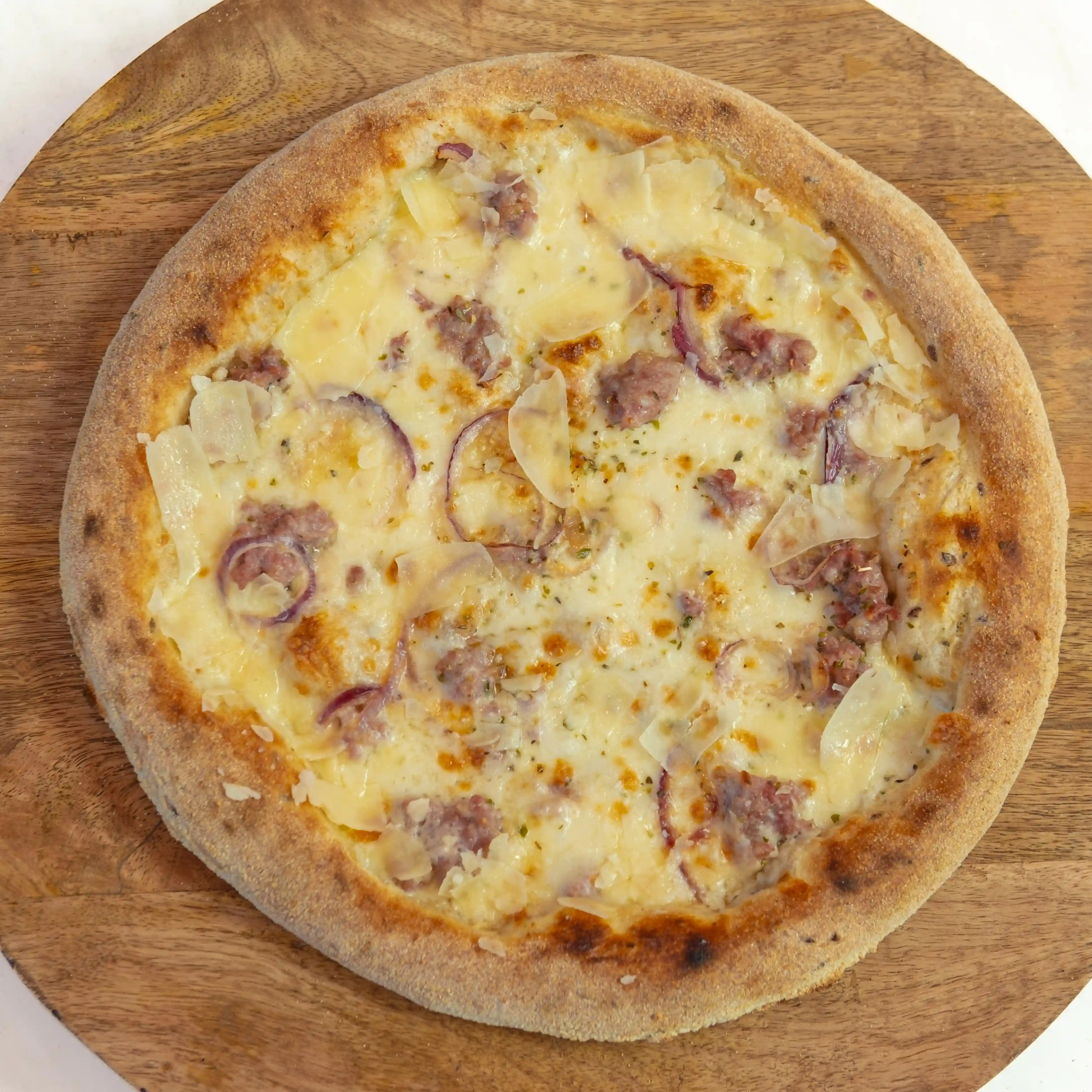 Crème fraîche, Italian sausage, Red onions, Mozzarella, Taleggio cheese