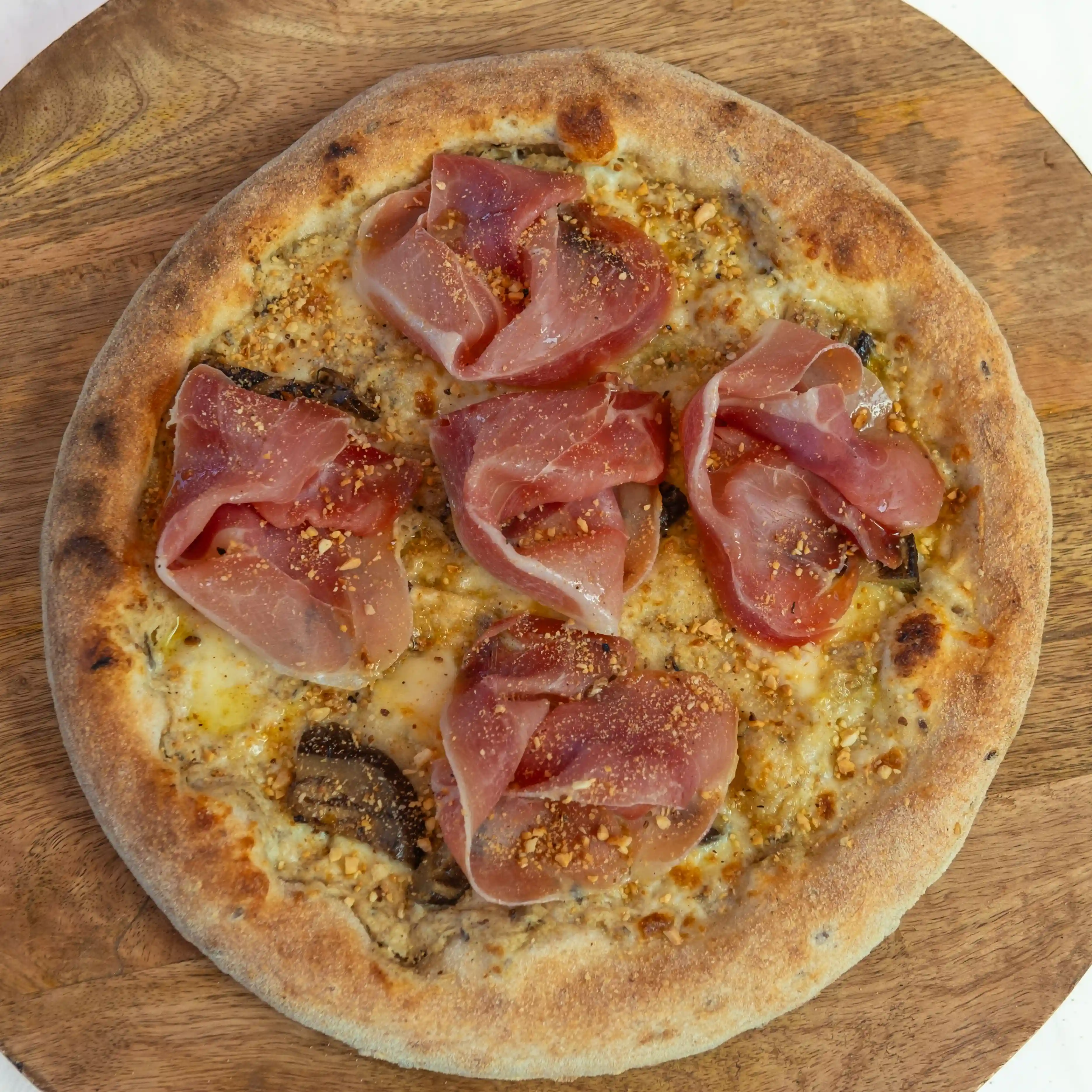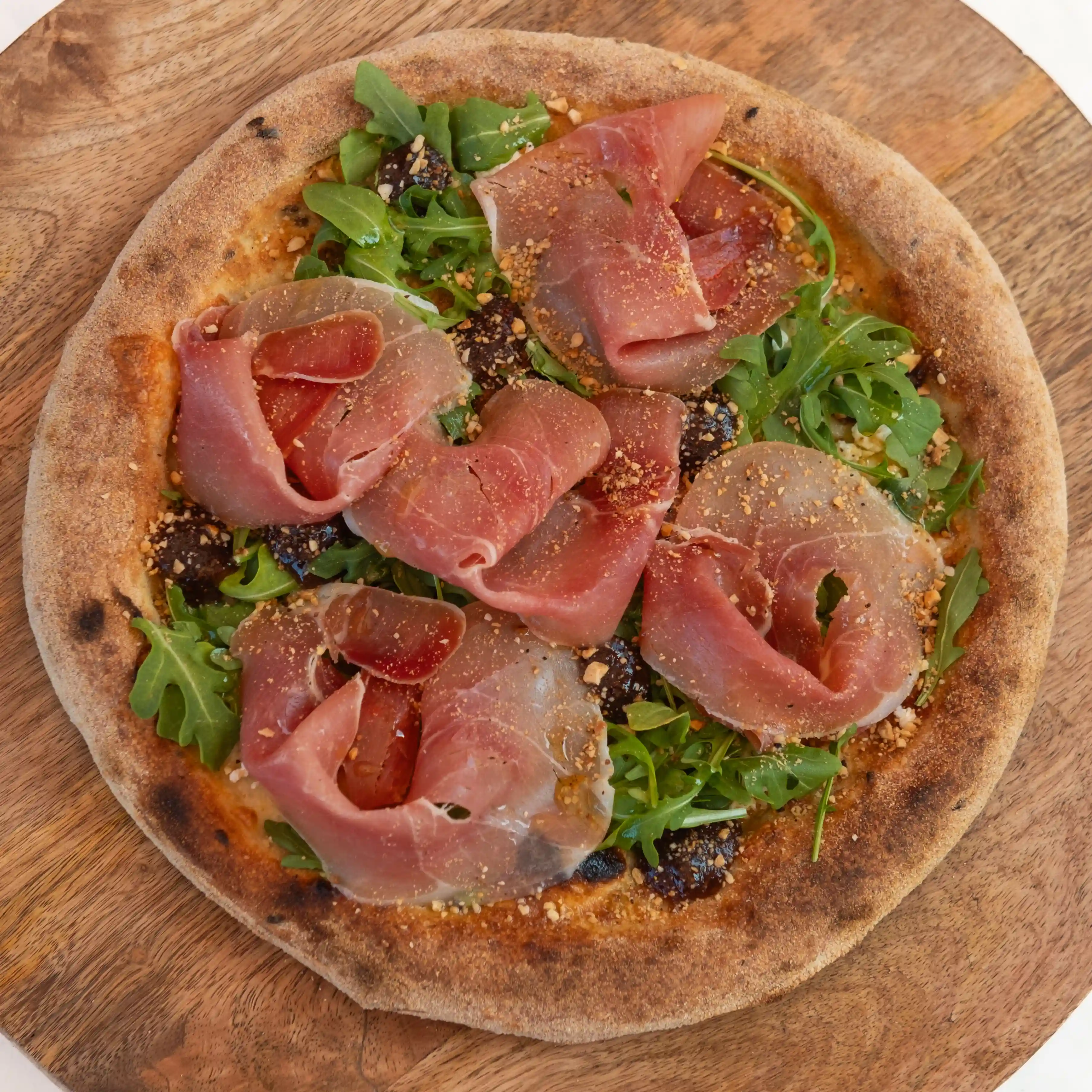 Mozzarella base, After cooking: Arugula, Prosciutto crudo ham, Goat cheese, Fig jam, Roasted almonds, drizzle of olive…