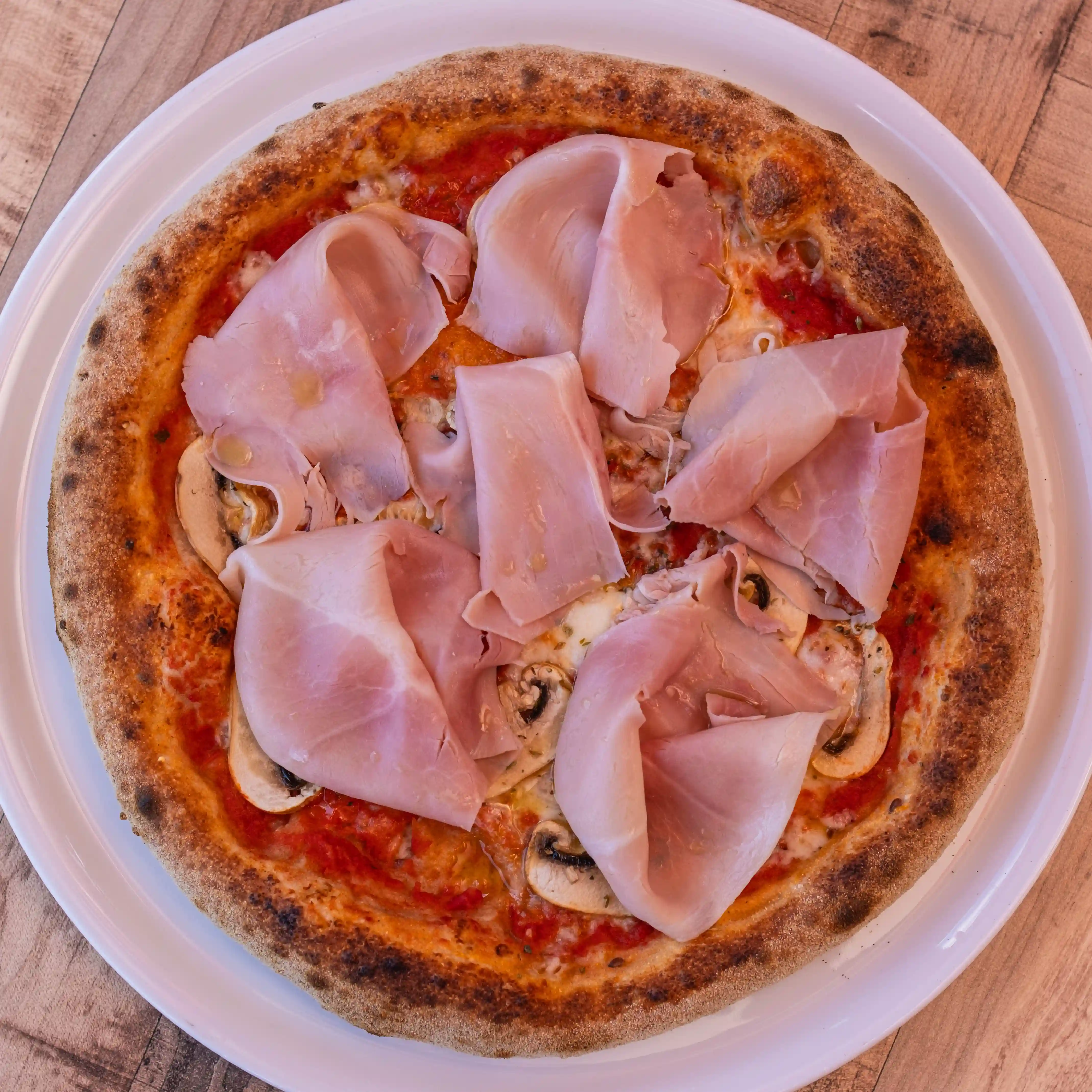 Tomato sauce, Mozzarella, Mushrooms, Oregano, After cooking: prosciutto cotto