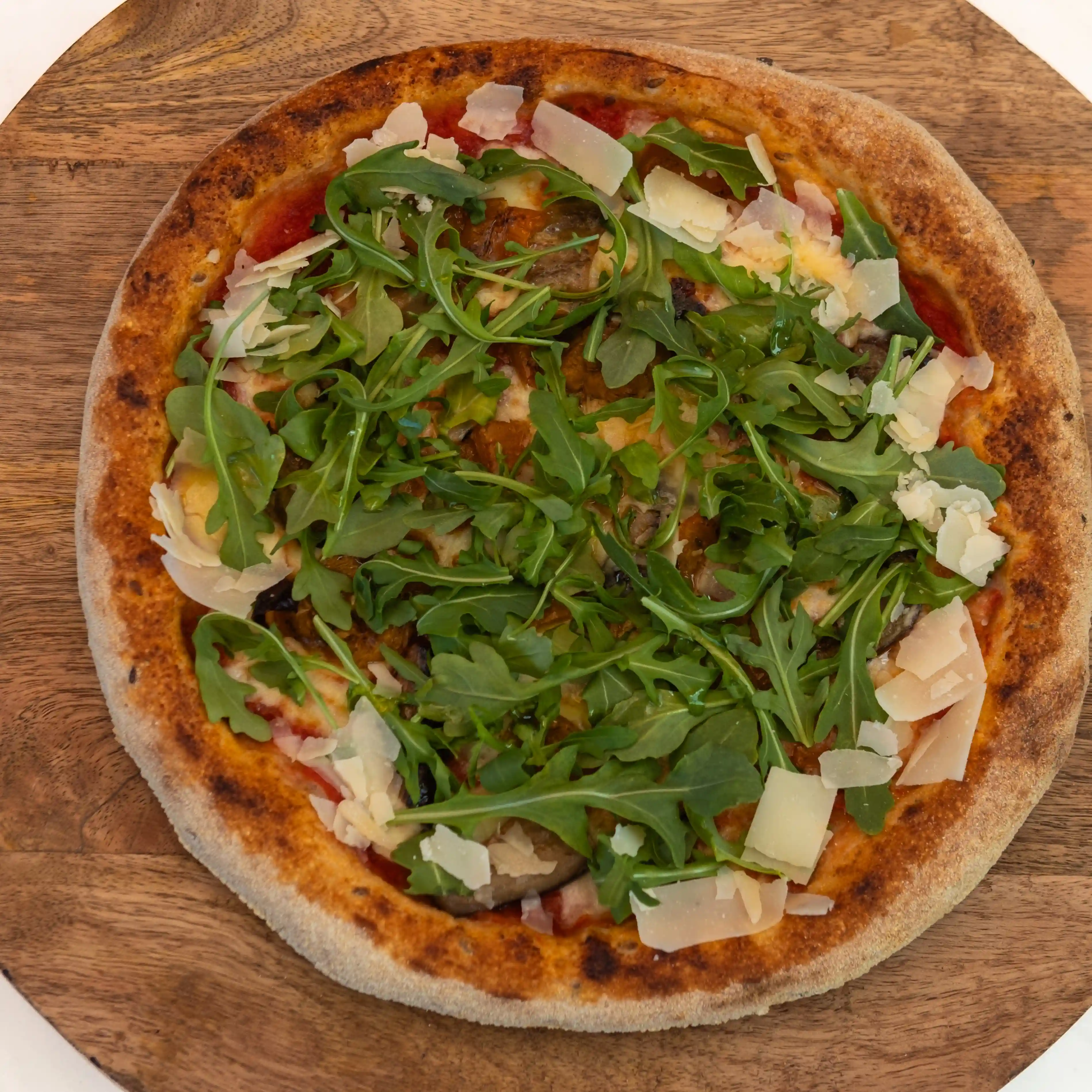 Tomato sauce, Mozzarella, Eggplant, Roasted peppers, After cooking: Arugula, Parmesan, Extra virgin olive oil drizzle