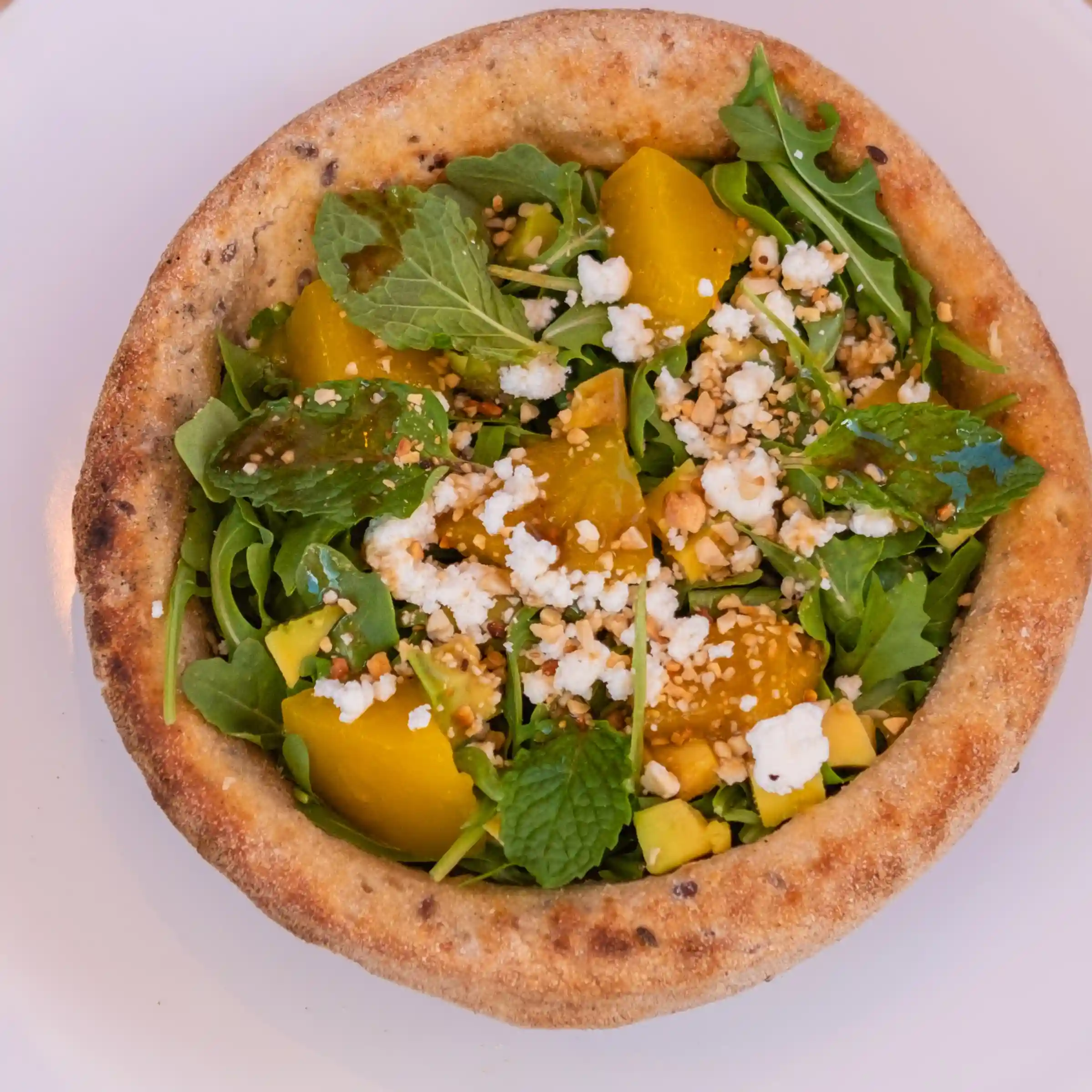 A gourmet salad served in a crispy pizza dough bowl, Arugula, Mango, Avocado, Crumbled Feta, Fresh Mint, Toasted Almond…