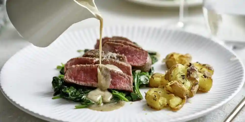 Pepper or Gorgonzola Sauce, Mashed Potatoes, Vegetables