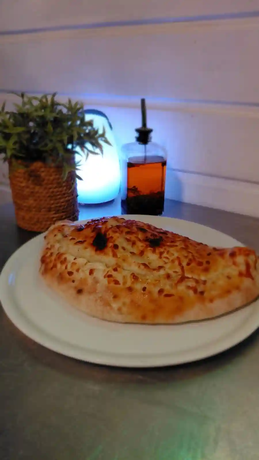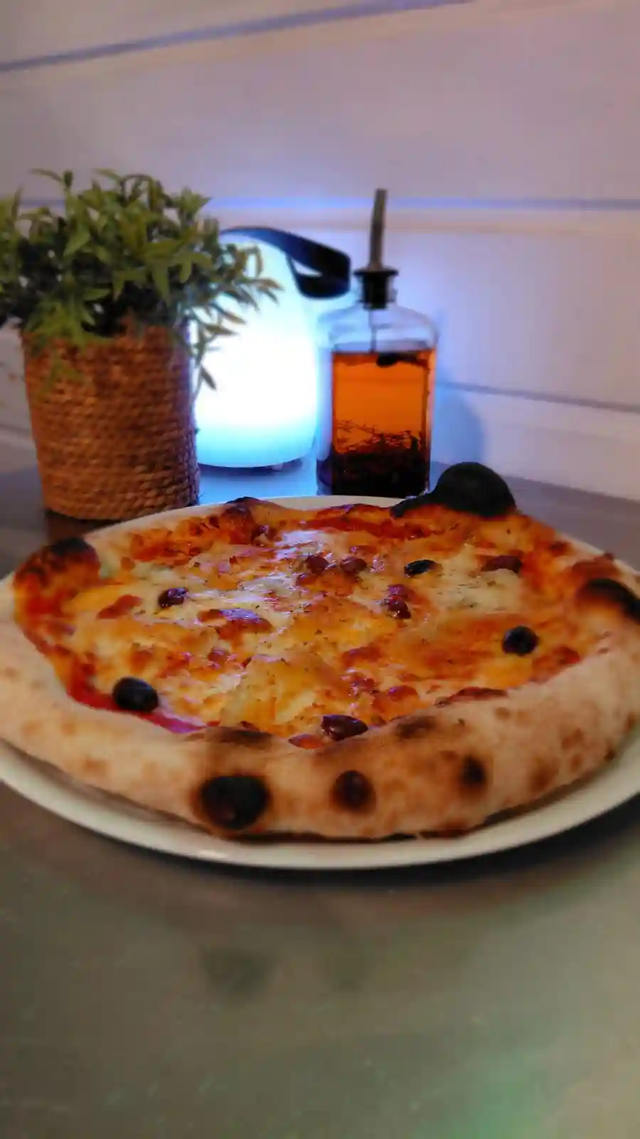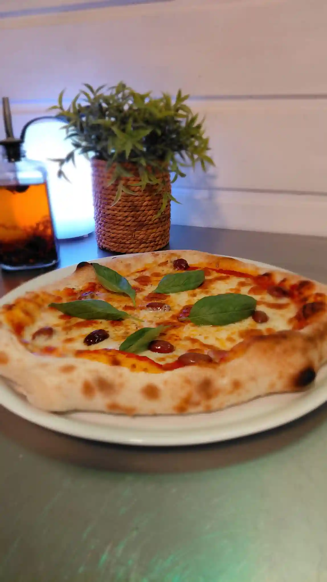Tomato or cream base, Mozzarella, Goat's cheese, Gorgonzola, Olives, Oregano