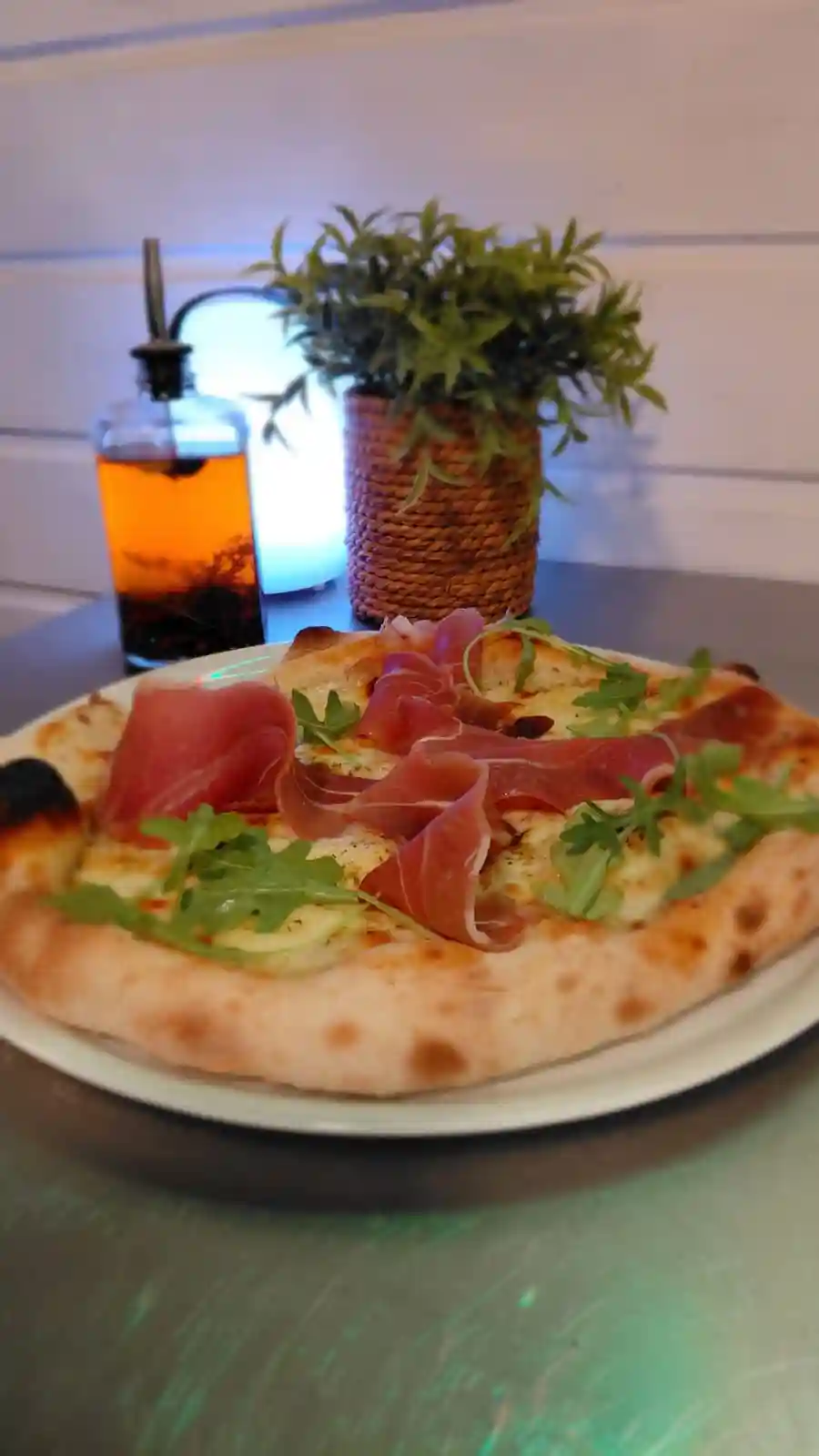 Tomato base, Mozzarella Di Buffala, Arugula, Cherry tomatoes, Parmesan, Raw ham, Pesto, Pine nuts