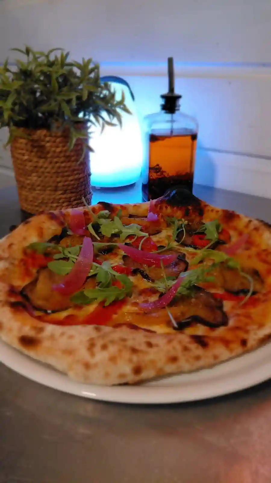 Tomato base, Mozzarella, Peppers, Eggplant, Pickles, Arugula, Pesto