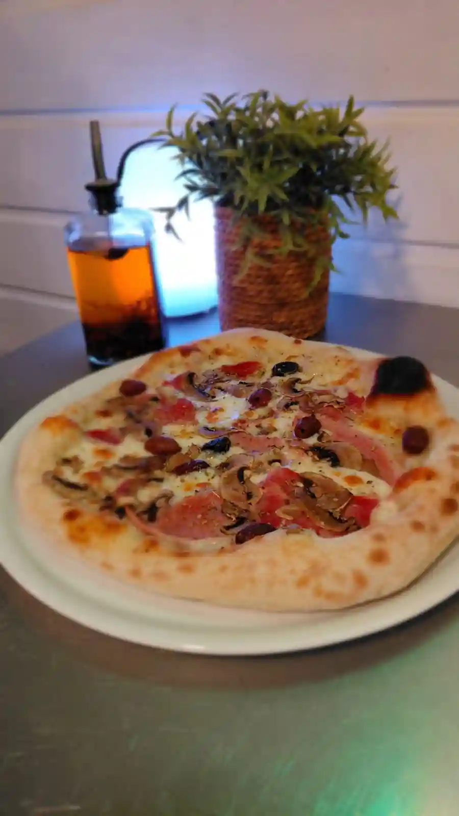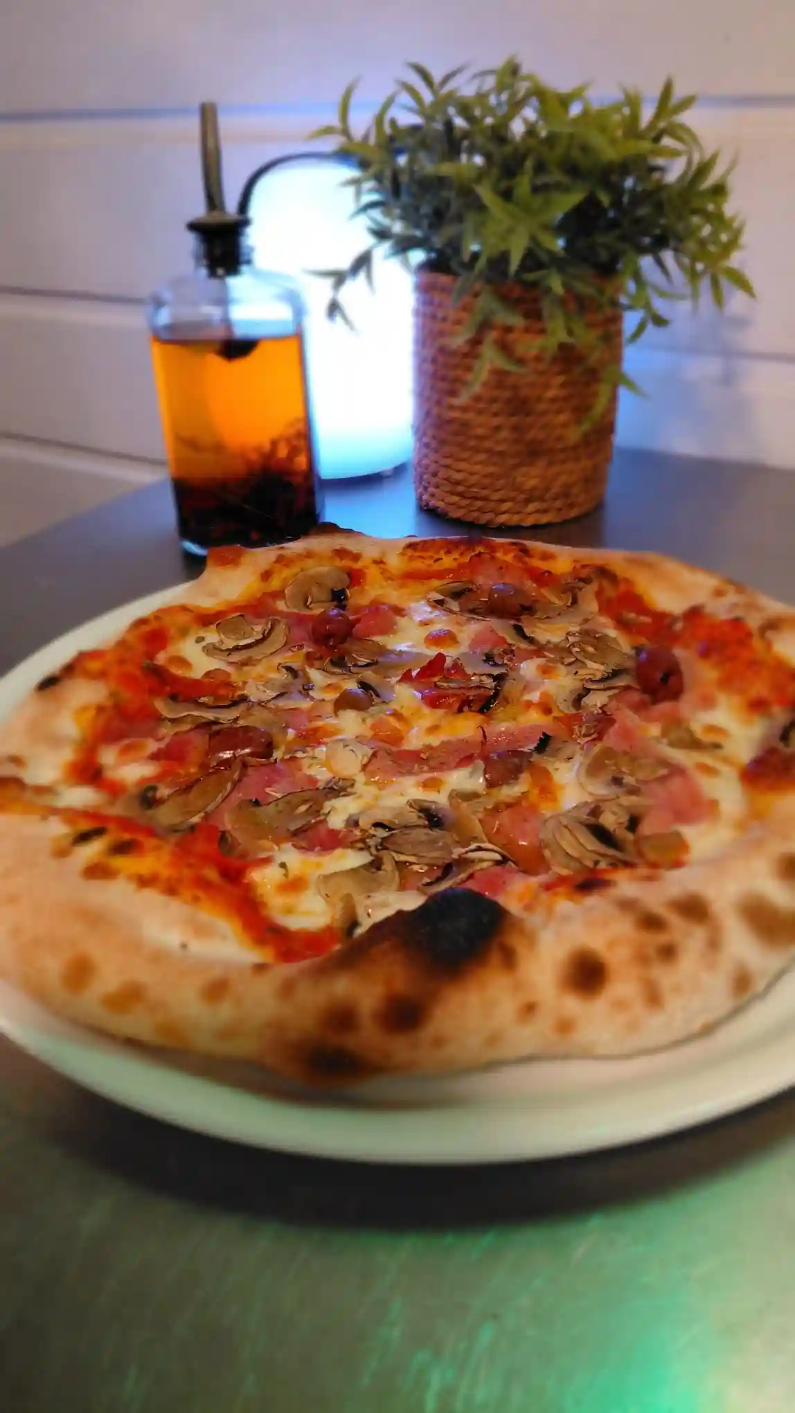 Tomato base, Mozzarella, White ham, Mushrooms, Olives, Oregano